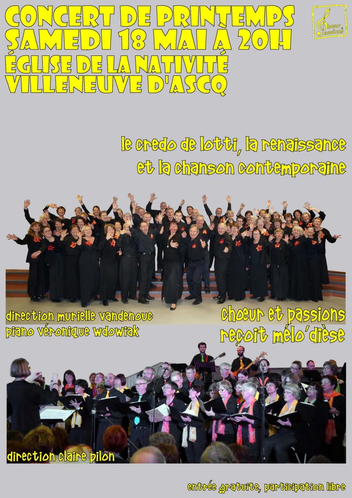 Choeur & Passions, dirigé par Murielle et accompagné de la pianiste Véronique Wdowiak, chantera le samedi 18 mai à 20h, église de la Nativité à Villeneuve d’Ascq. A cette occasion, nous recevrons la chorale Mélo’dièse.
